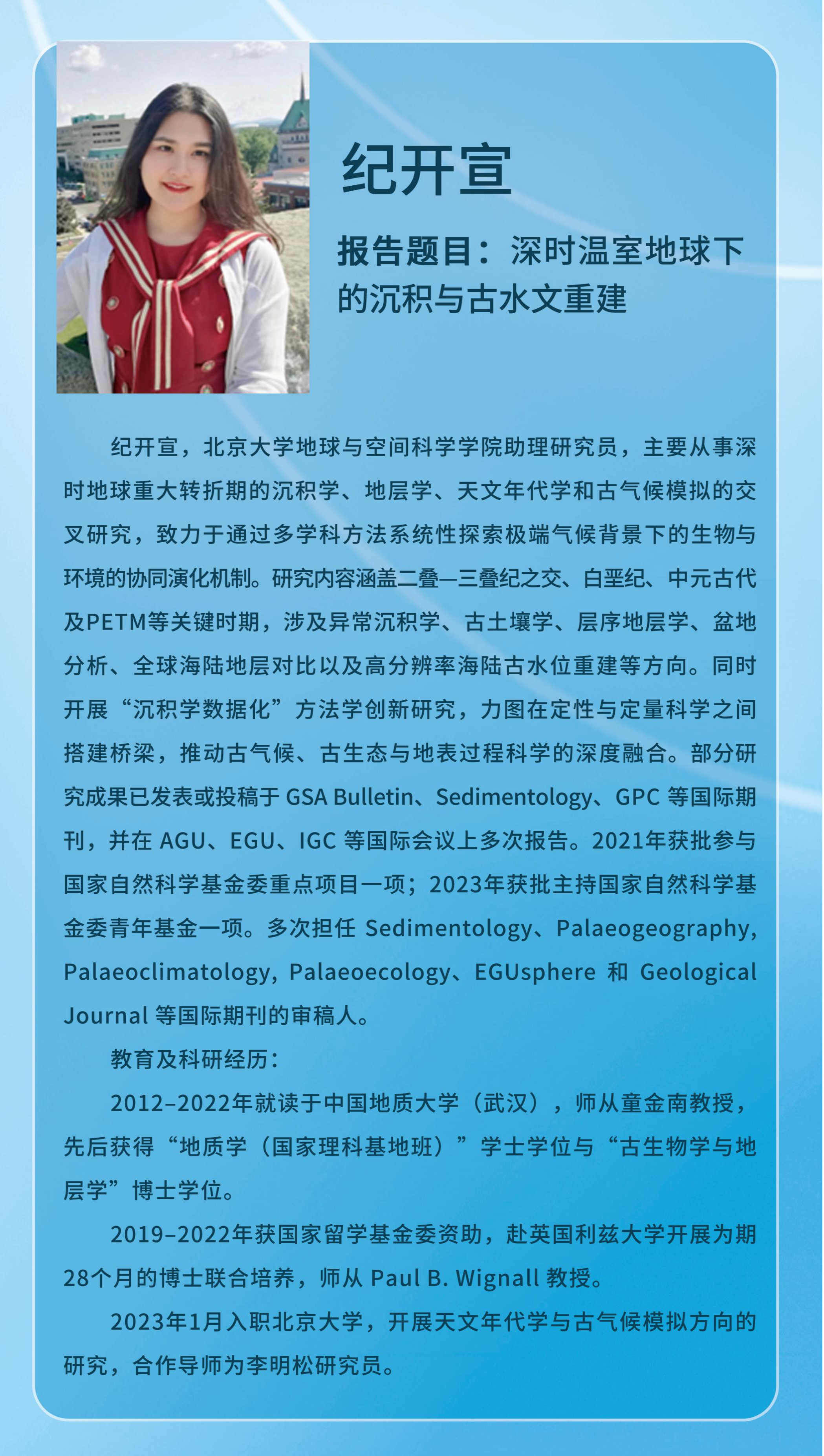 纪开宣的报告题目为:深时温室地球下的沉积与古水文重建。报告聚焦于两个地质历史上的关键时期:二叠纪—三叠纪之交与晚白垩世(约7300–6600万年前)。在二叠纪—三叠纪之交的研究中,纪博士从中国华北盆地异常沉积学和盆地分析角度切入,系统剖析了该时期全球极端气候背景下的沉积异常现象与陆相系统的非稳态响应过程。通过对华北盆地、德国盆地、意大利和华南等多个海、陆相盆地的剖面精细解剖与对比,她建立了可全球对比的三级层序地层框架,揭示了构造地形、气候变化和海平面波动共同驱动下的沉积组合演化机制。在晚白垩世研究中,纪博士结合高分辨率沉积旋回分析与“沉积噪声模型”,重建了十万至百万年尺度的古水位变化轨迹,并结合复杂地球气候模型CESM气候模拟结果,探索了天文轨道参数、季节性降水与基准面变动之间的耦合过程,揭示了天文轨道—气候—水文—沉积四者之间的精细互动关系。这项研究不仅深化了我们对深时气候剧变时期陆相系统复杂响应机制的理解,也推动了沉积学、旋回地层学与古气候模拟的融合探索,为跨尺度重建地球系统演化过程、认识古生态危机的背景与特征,以及思考其与当代环境变化之间的关联,提供了有力的研究支撑与启发。
