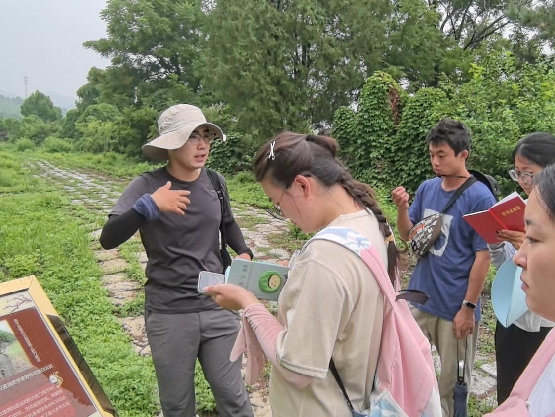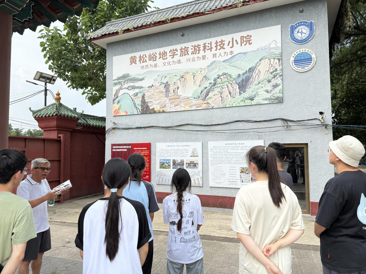 7月9日,实践团前往科技小院考察小院建设,详细考察中元古代高于庄组地层剖面的研学路线。在黄松峪地学旅游科技小院首席专家张绪教教授的带领下,团队共同回顾了小院的工作成果与发展历程,提出了以突出旅游地学特色为目标的科技小院建设思路:在外墙增设地学科普长廊,以进一步凸显小院的专业定位,并为研学活动增添更丰富的地学元素;科普解说牌须保证简短精炼、图文并茂,以增强内容的可读性与吸引力。
