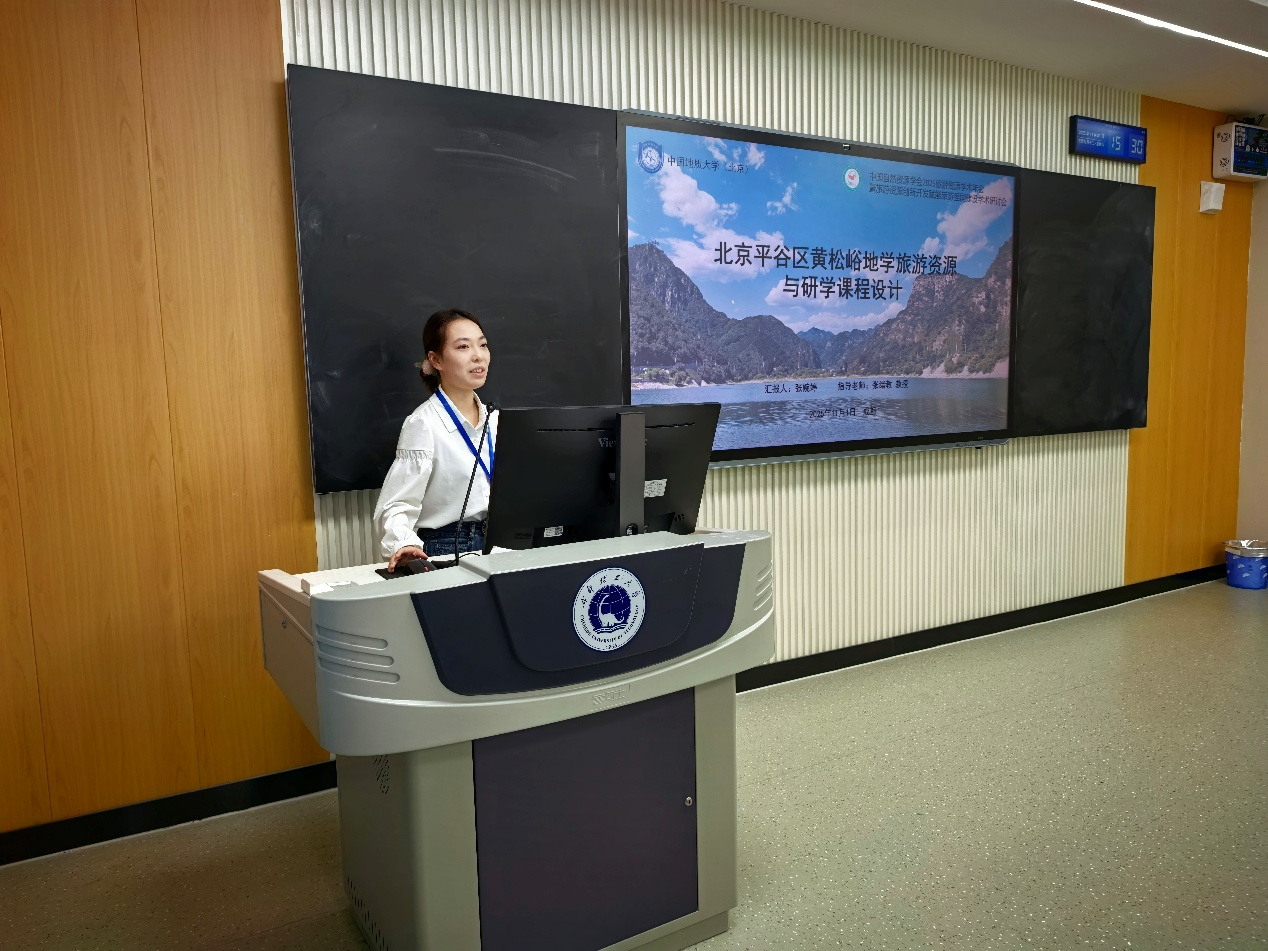 入驻黄松峪地学旅游科技小院的研究生重点展示了黄松峪乡地学研学课程开发成果:张婉婷以“北京平谷区黄松峪地学旅游资源与研学课程设计”为题,介绍了黄松峪地学旅游科技小院及梨树沟的研学课程体系;黄艳玲分享了在自然文化视角下湖洞水景区“红色+地质”地学研学路线的设计理念与实践;厉芳辰依托京东大溶洞的岩溶景观,讲解了溶洞类研学课程的开发思路和路径;王颖则围绕黄松峪段明长城修建与地质地貌的关系,深入剖析了长城蕴含的丰富地质文化内涵。